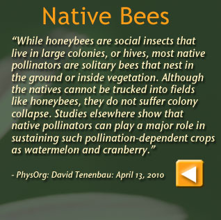 A growing interest in native pollinators, specifically bees, is partially a result of massive public awareness about the decline of European honeybees world wide. Continued research into the cause of honeybee decline, called 'colony collapse disorder' or CCD, as well as support of native pollinator species can help to promote a healthy and vibrant population of these hard-working organisms.